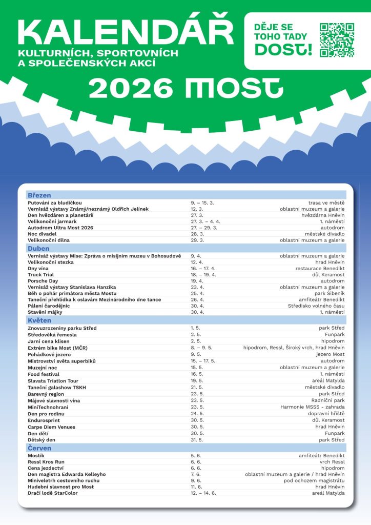 V Mostě se ani v roce 2026 nebudete nudit. Připraven je pro vás nespočet různých akcí. A protože je výčet vskutku rozmanitý, jsme si jistí, že si z našeho kalendáře vybere opravdu každý. Těšit se můžete jak na některé již tradiční akce města, tak na různé sportovní a kulturní akce či výstavy. Na své si samozřejmě přijdou také rodiny s dětmi, pro které je naplánováno mnoho zábavných akcí. Na tento rok jsou ale připraveny i naprosté novinky, které se, doufáme, budou také těšit velké oblibě.