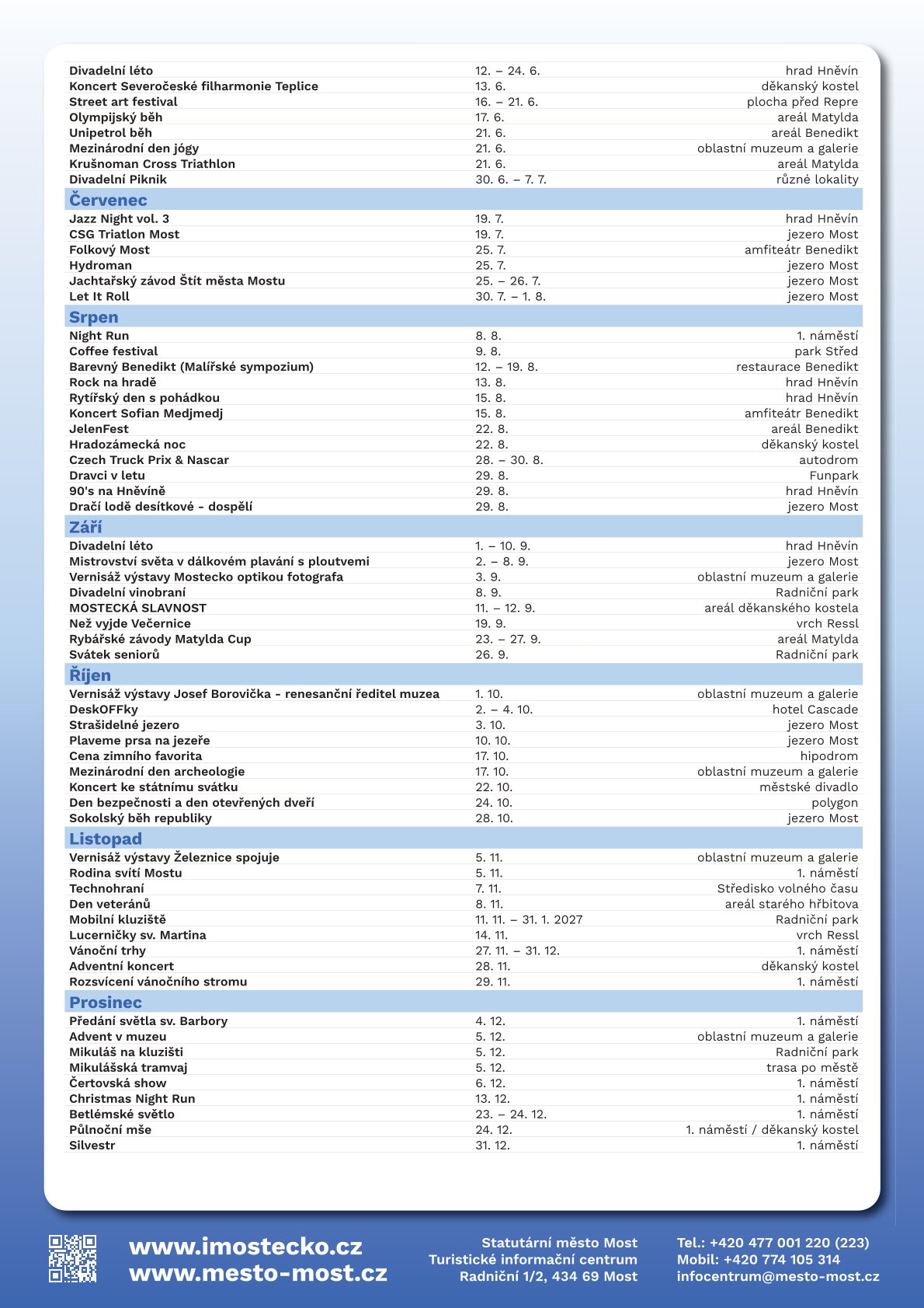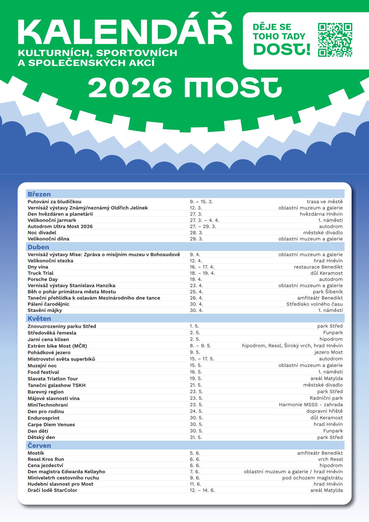 V Mostě se ani v roce 2026 nebudete nudit. Připraven je pro vás nespočet různých akcí. A protože je výčet vskutku rozmanitý, jsme si jistí, že si z našeho kalendáře vybere opravdu každý. Těšit se můžete jak na některé již tradiční akce města, tak na různé sportovní a kulturní akce či výstavy. Na své si samozřejmě přijdou také rodiny s dětmi, pro které je naplánováno mnoho zábavných akcí. Na tento rok jsou ale připraveny i naprosté novinky, které se, doufáme, budou také těšit velké oblibě.