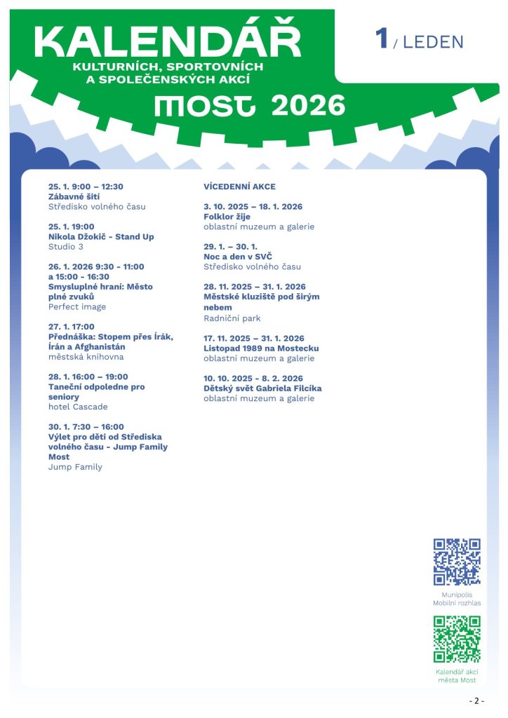 Chcete vědět, co všechno se dá tento měsíc v Mostě dělat? Tak to jste tady správně. Přinášíme vám aktuální přehled všech kulturních, sportovních a společenských akcí, které můžete navštívit. K jednotlivým akcím postupně zveřejňujeme podrobné informace zde. Pro týdenní přehledy akcí a upomínkové zprávy k těm víkendovým si stáhněte aplikaci Munipolis – Mobilní rozhlas. Stačí si jen při registraci zaškrtnout, že chcete dostávat přehled kulturních akcí.
