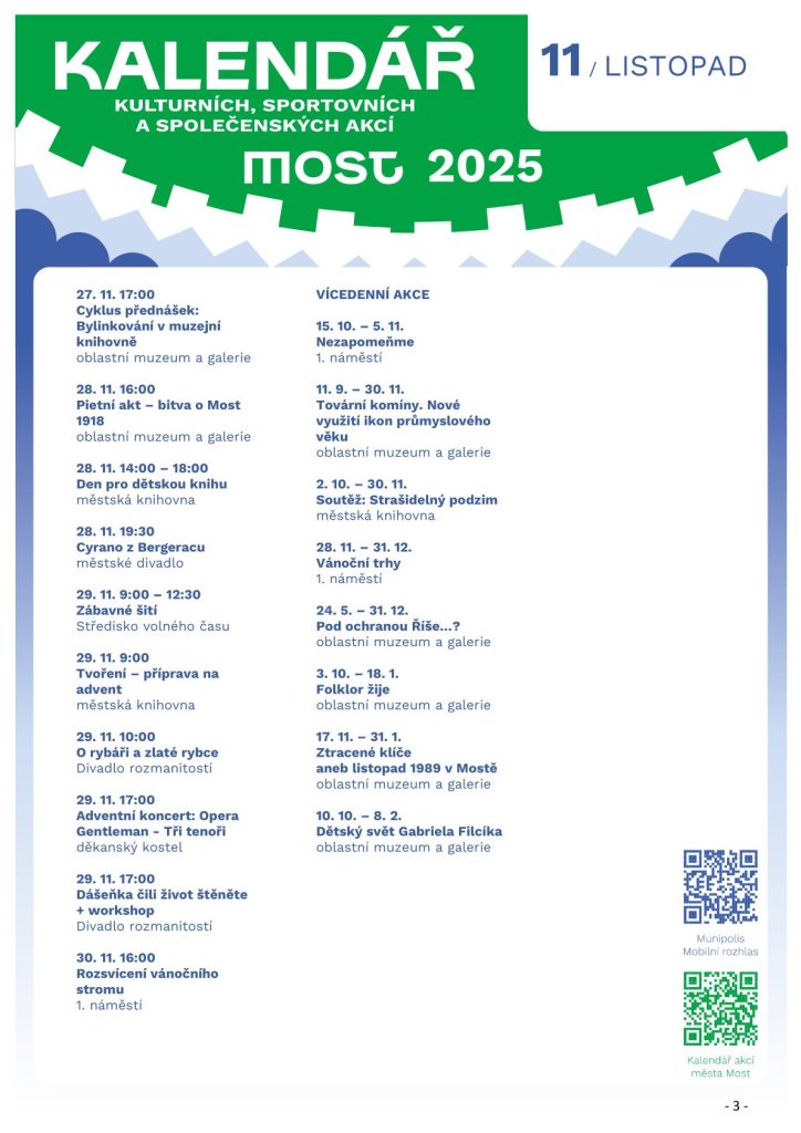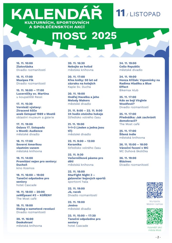 Chcete vědět, co všechno se dá tento měsíc v Mostě dělat? Tak to jste tady správně. Přinášíme vám aktuální přehled všech kulturních, sportovních a společenských akcí, které můžete navštívit. K jednotlivým akcím postupně zveřejňujeme podrobné informace zde. Pro týdenní přehledy akcí a upomínkové zprávy k těm víkendovým si stáhněte aplikaci Munipolis – Mobilní rozhlas. Stačí si jen při registraci zaškrtnout, že chcete dostávat přehled kulturních akcí.