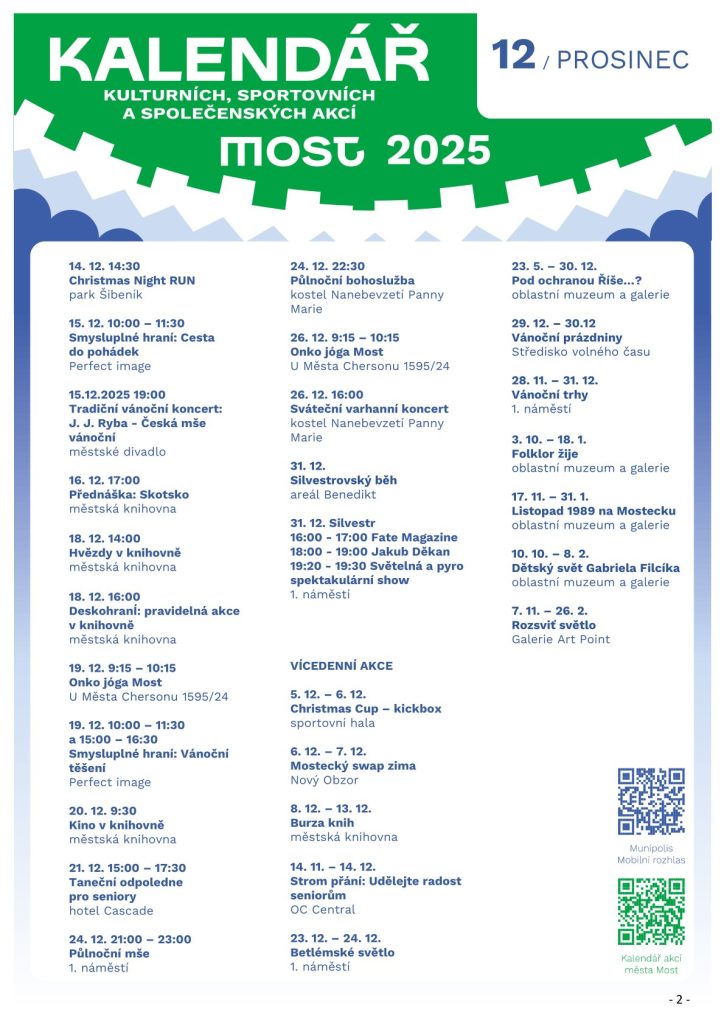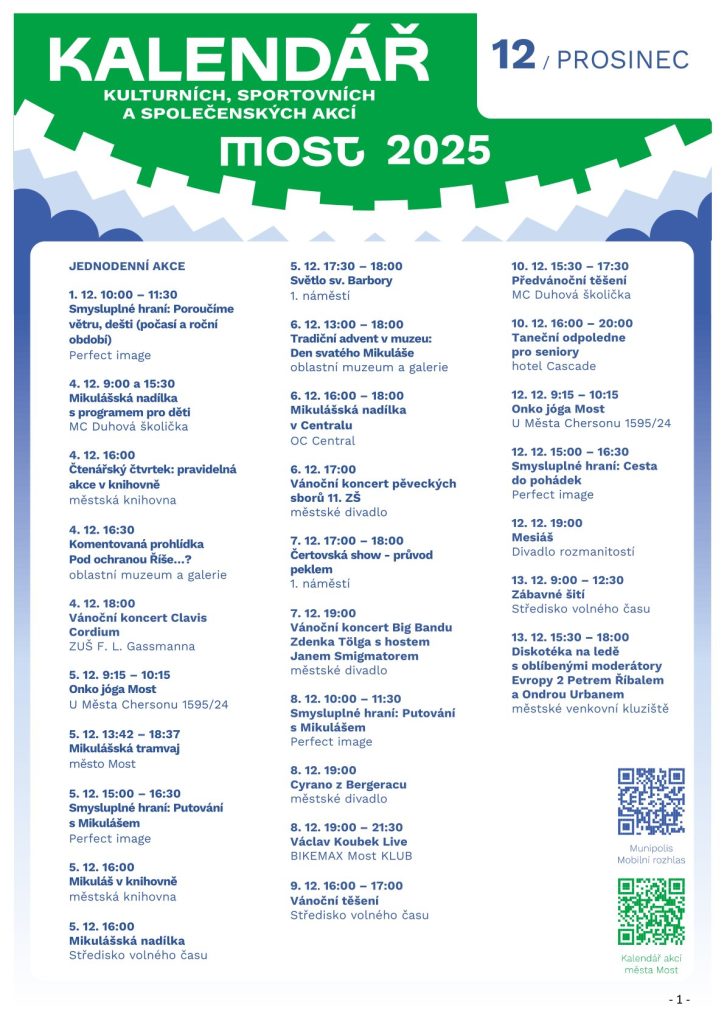 Chcete vědět, co všechno se dá tento měsíc v Mostě dělat? Tak to jste tady správně. Přinášíme vám aktuální přehled všech kulturních, sportovních a společenských akcí, které můžete navštívit. K jednotlivým akcím postupně zveřejňujeme podrobné informace zde. Pro týdenní přehledy akcí a upomínkové zprávy k těm víkendovým si stáhněte aplikaci Munipolis – Mobilní rozhlas. Stačí si jen při registraci zaškrtnout, že chcete dostávat přehled kulturních akcí.